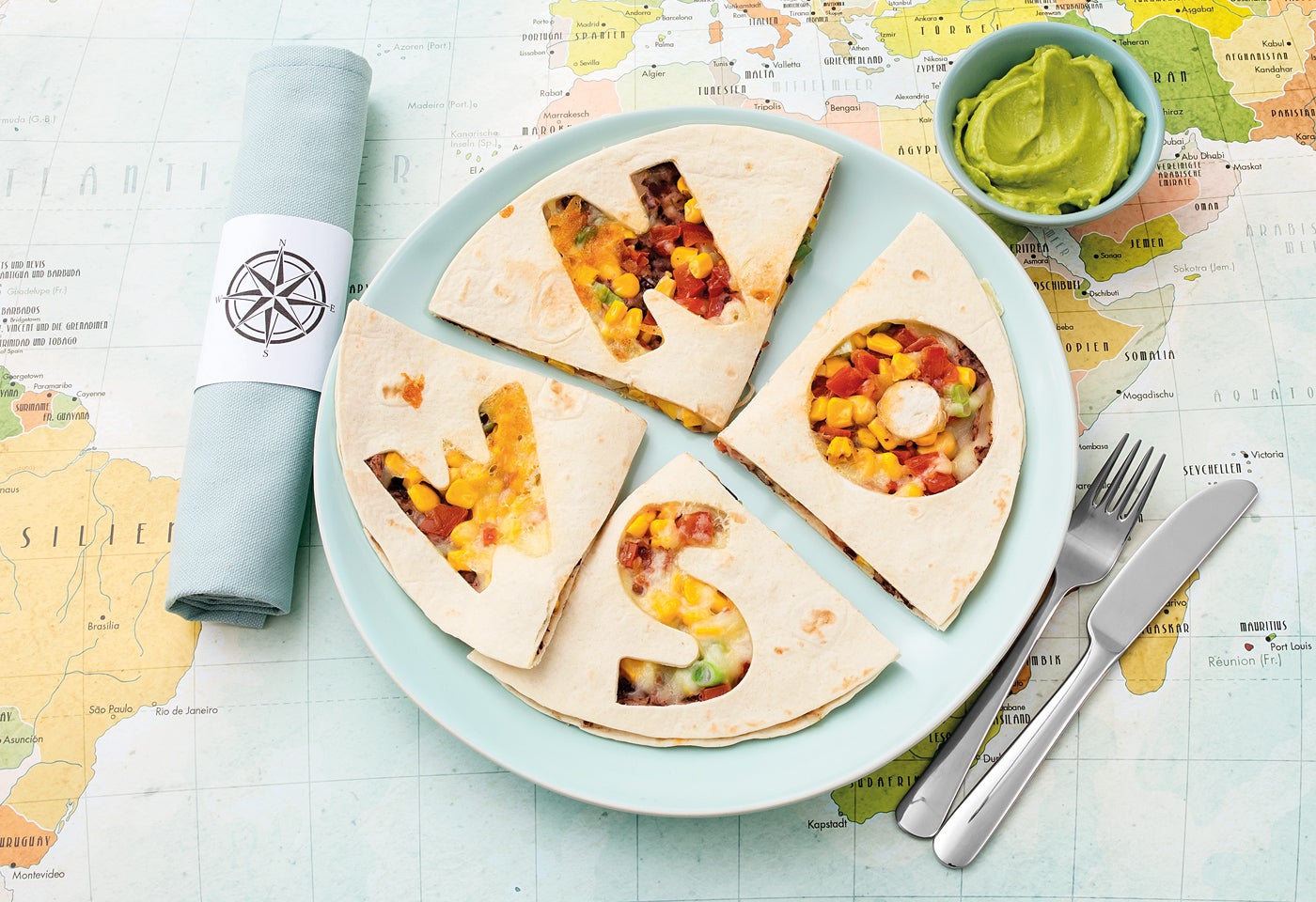 Heize das Backrohr auf 100 °C (Ober-/Unterhitze) vor. Bestreiche vier Tortillafladen mit etwas Bohnenmus, verteile die Tomaten-Mais-Mischung darauf und bestreue sie mit Mozzarella. Stich die Buchstaben N, S, O und W aus jedem der vier übrigen Fladen aus, bedecke mit ihnen die bestrichenen Fladen und drücke sie leicht fest. Brate die Tortillas nacheinander bei niedriger Hitze in einer Pfanne ohne Öl langsam heraus. Wenn der Käse zu schmelzen beginnt, drehe die Quesadilla um und brate sie weiter, bis der Käse vollständig herausgebacken ist. Halte die Quesadillas im Backrohr warm.