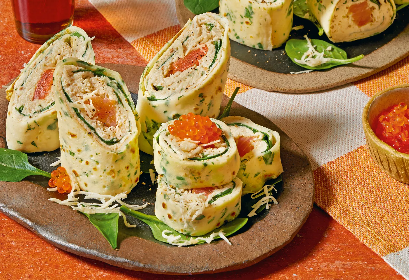 - accessibility.recipes.cookingstepPalatschinkenröllchen in Stücke schneiden, anrichten und mit restlichem Spinat, Kren, Kaviar und etwas Pfeffer garnieren.