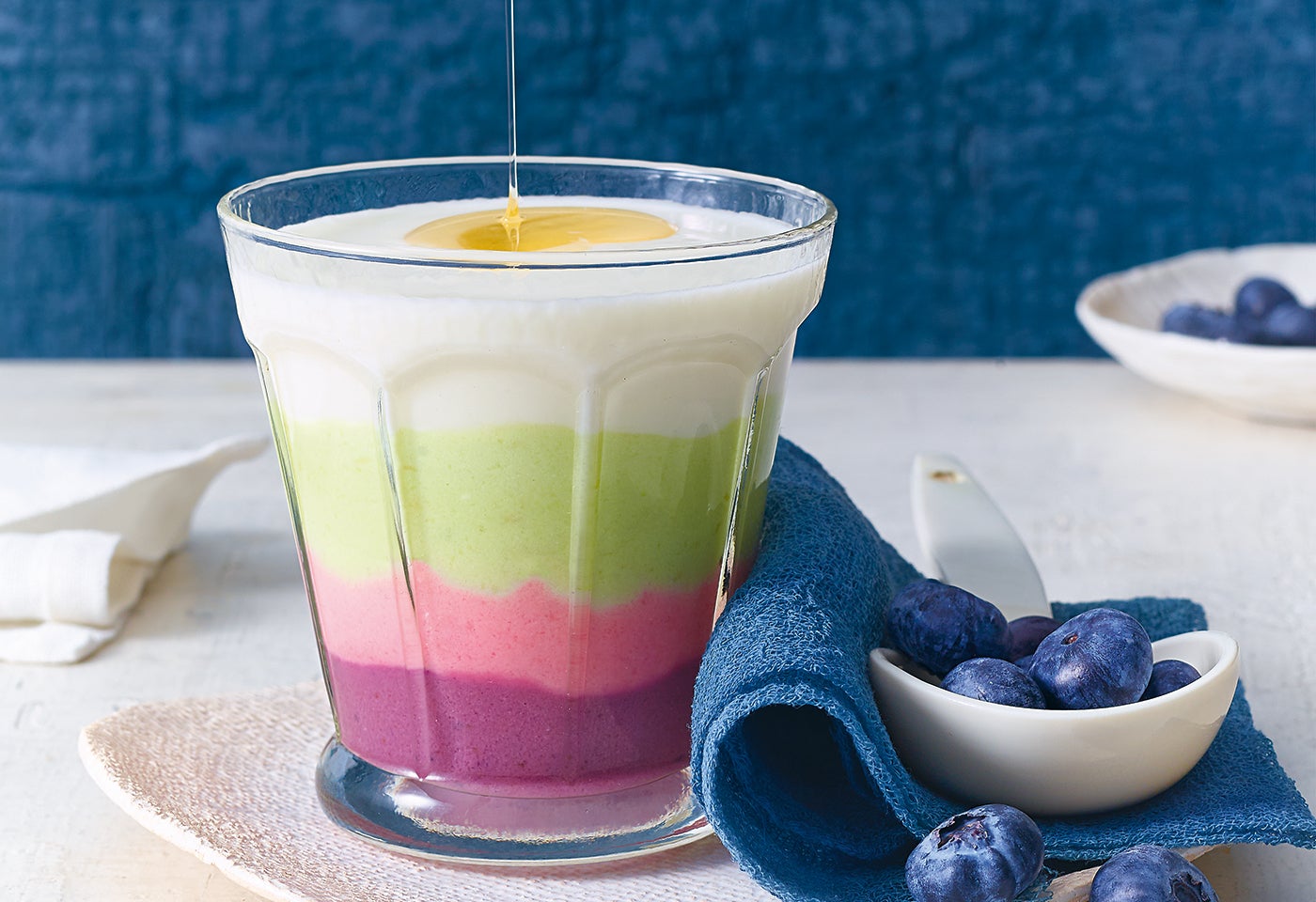 4 Dessertgläser (à 280 ml) schichtweise mit Heidelbeer-, Himbeer-, Avocado- und Kokos-Joghurt füllen, dazu das Joghurt jeweils mit einem Esslöffel vom Rand her ins Glas fließen lassen. Gläser bis zum Servieren kalt stellen.