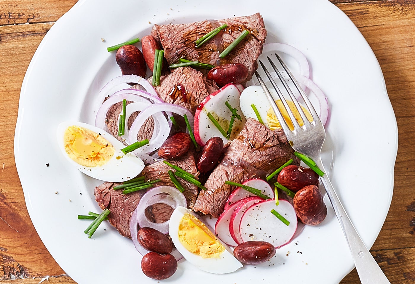 Das Rindfleisch gegen die Faser in dünne Scheiben schneiden. Zusammen mit den Käferbohnen, den Zwiebelringen, Radieschen und geviertelten Eiern auf Tellern anrichten. Apfelessig, Kürbiskernöl, Salz und einen Schuss Wasser zu einer Marinade verrühren und über den Rindfleischsalat träufeln. Mit frisch gemahlenem Pfeffer und Schnittlauch bestreuen.