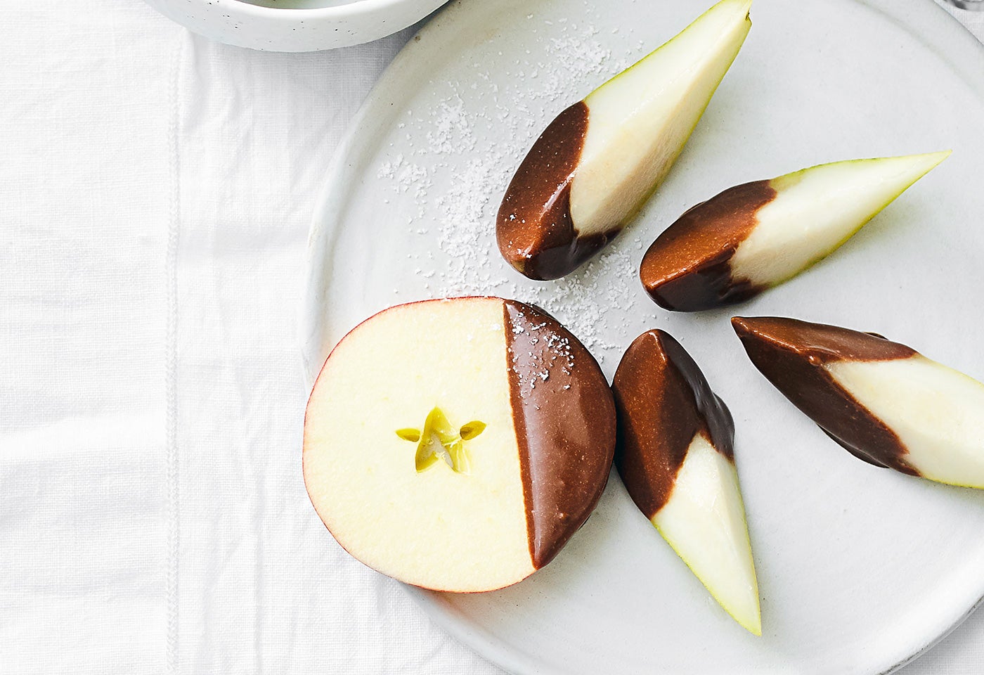 Birnen und Äpfel anrichten und mit dem Schokoladefondue servieren.