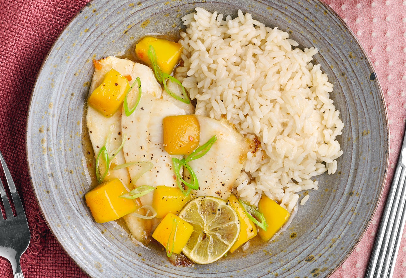 Währenddessen Chilisauce mit 2 EL Wasser und Mangowürfeln erhitzen. Reis nach Packungsanleitung zubereiten. Jungzwiebel in Ringe schneiden.