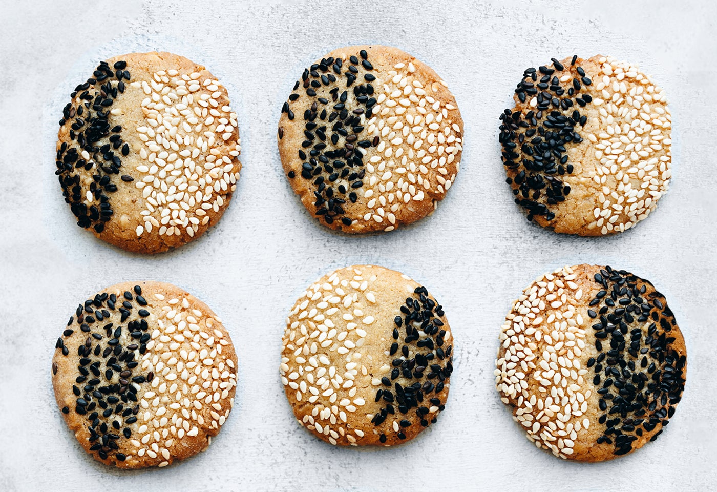 Backrohr auf 180 °C (Ober-/Unterhitze) vorheizen. Zwei Backbleche mit Backpapier auslegen. Weißen und schwarzen Sesam getrennt auf Teller geben. Jeweils eine walnussgroße Portion Teig abnehmen und erst zu einer Kugel formen, dann zu einem Kreis flachdrücken. Kreise oben mit etwas Wasser bestreichen, jeweils zur Hälfte mit weißem, zur Hälfte mit schwarzem Sesam bestreuen und die Körner leicht festdrücken (oder die Kreise mit der befeuchteten Seite in den Sesam drücken).