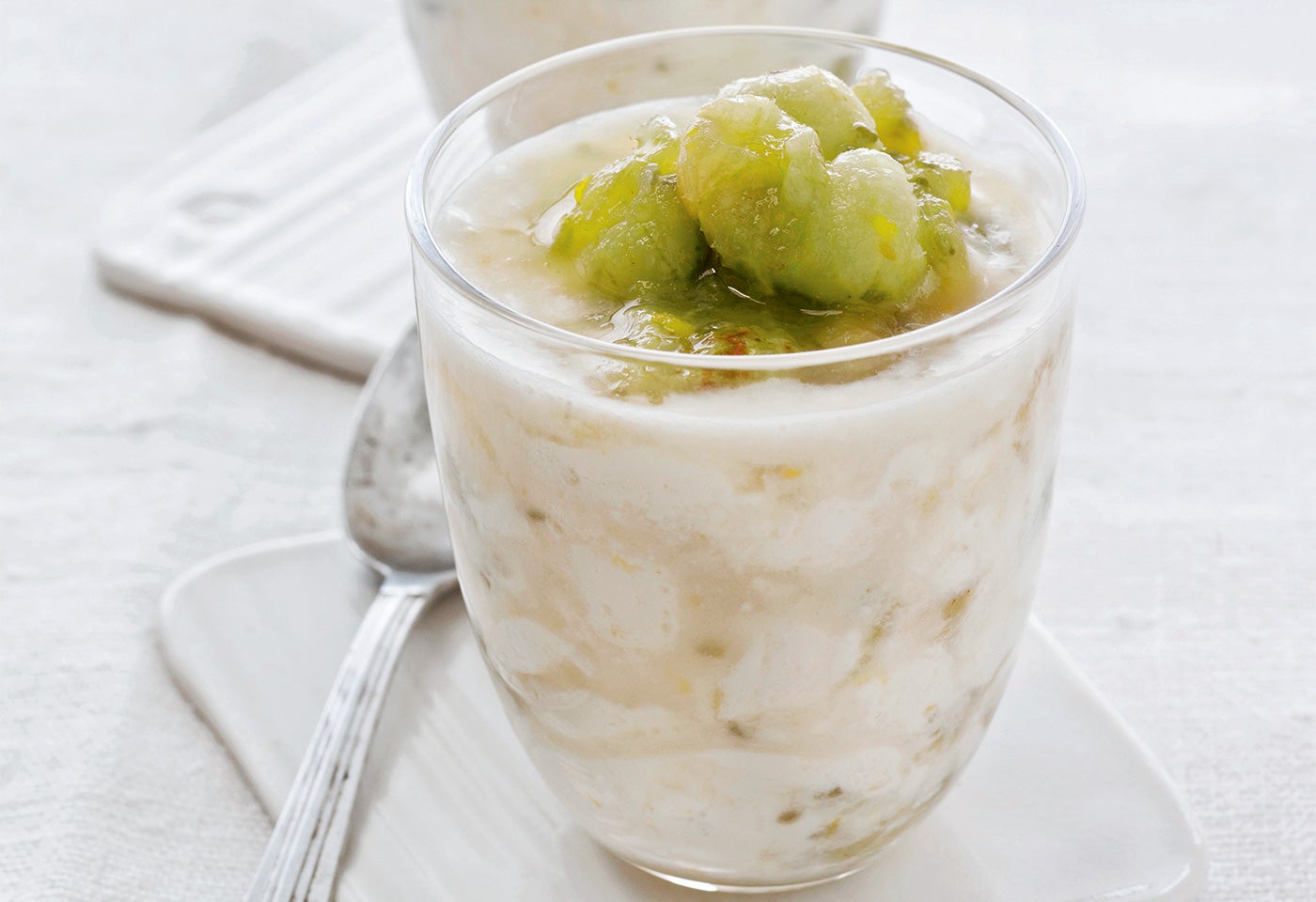 Die Mischung in Serviergläser füllen und die restlichen Stachelbeeren darauf verteilen. Mindestens 60 Minuten kalt stellen.