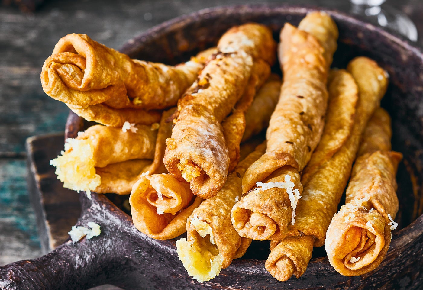 Käse klein würfeln, auf den Krapfen verteilen und diese eng einrollen.