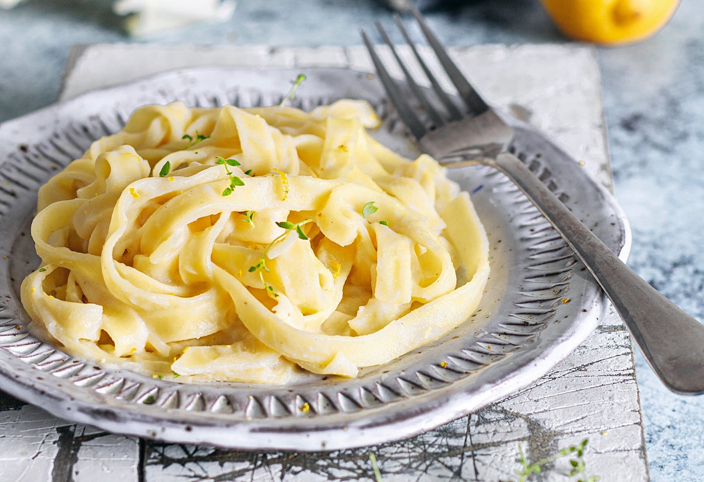 Zutaten für remove add Portion(en)1 kleinerKarfiol200 mlGemüsesuppe500 gTagliatelle1 Thymianzweig0.5 Bio-Zitrone3 ELSauerrahm Salz schwarzer Pfeffer a. d. MühleZubereiten