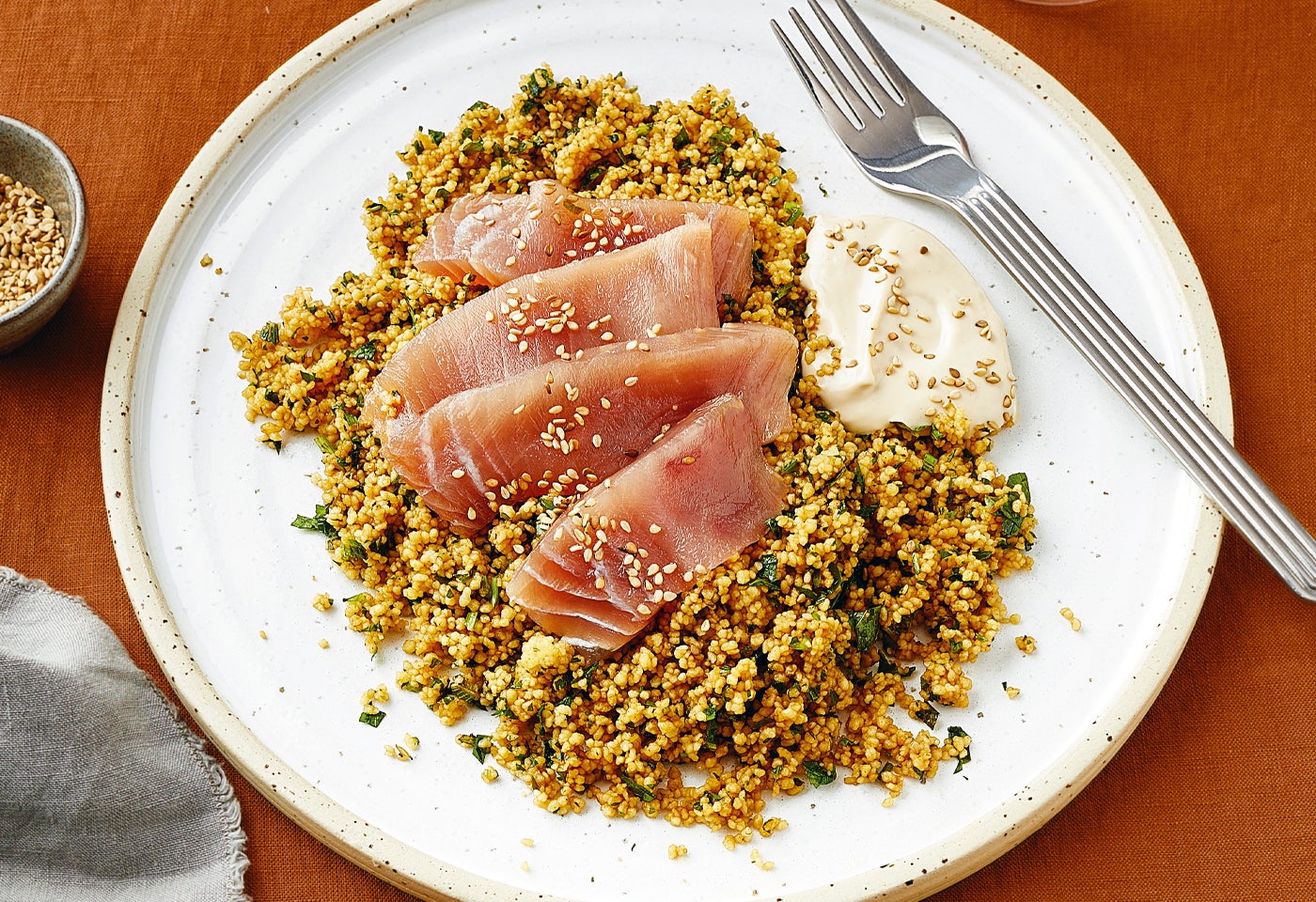 Zutaten für remove add Portion(en)75 gMayonnaise (50 %)3 ELSojasauce0.25 Grundrezept Taboulé0.5 ELSesam125 gaufgetaute ThunfischsteaksZubereiten