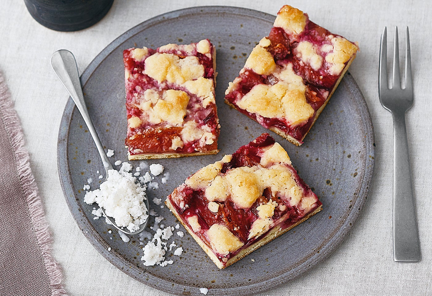 Kuchen in Stücke schneiden und anrichten. Mit dem restlichen Staubzucker (20 g) bestreuen und servieren.
