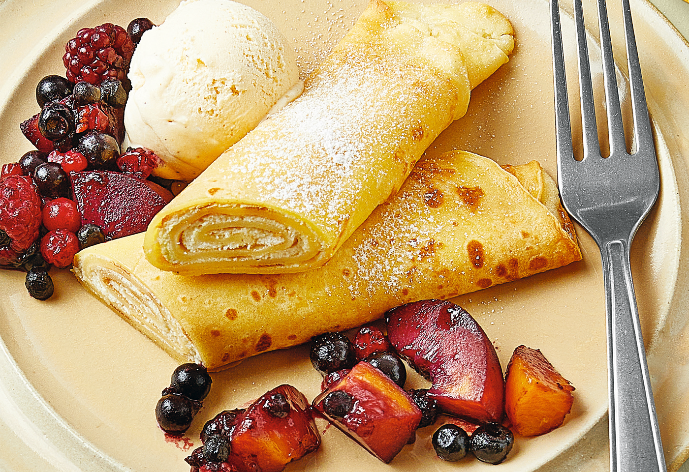 Die Palatschinken halbieren, mit warmen Früchten und Eis anrichten und mit Staubzucker bestreuen.