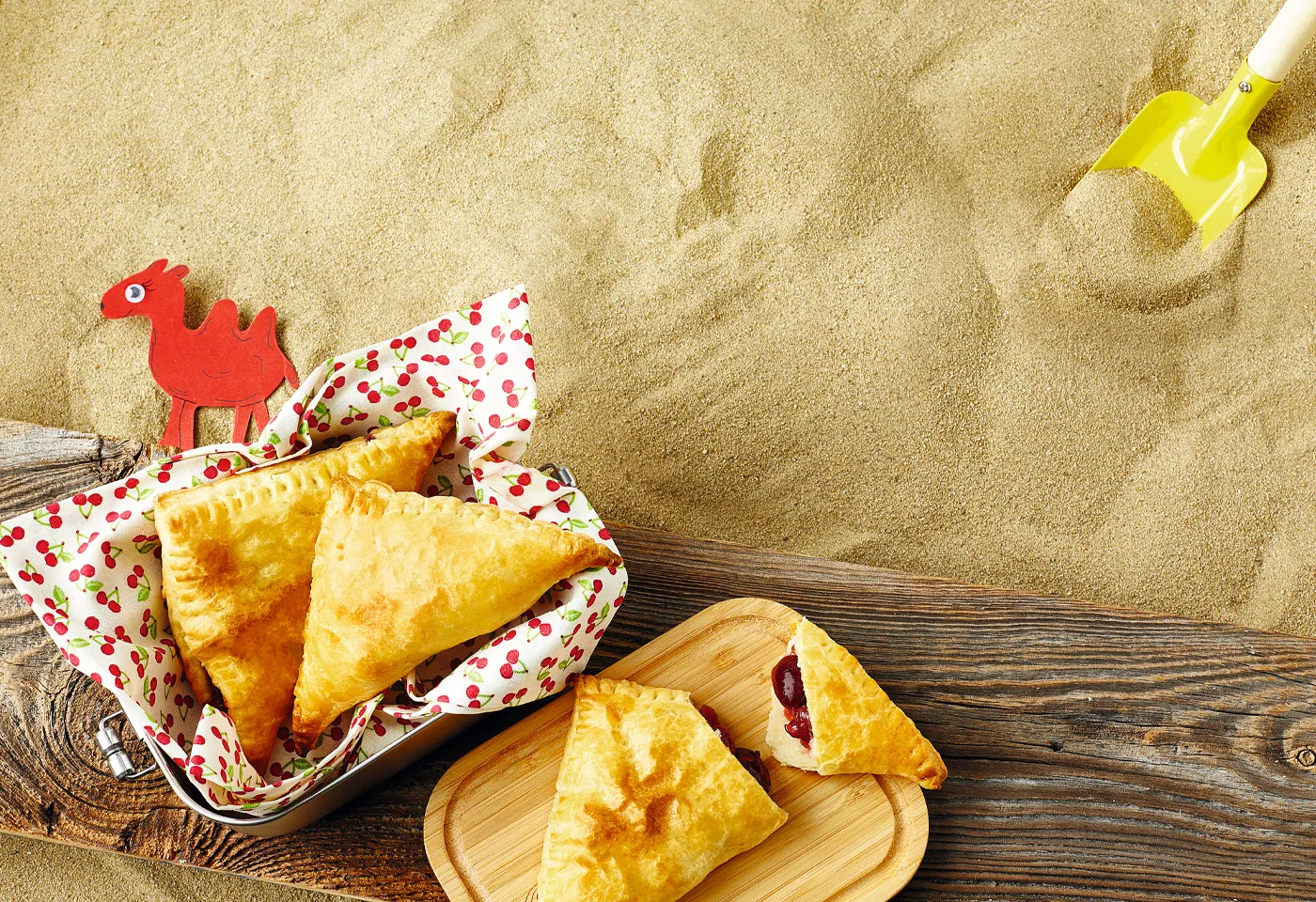 Heize das Backrohr auf 200 °C (Ober-/Unterhitze) vor. Gib etwas Mehl auf die Arbeitsfläche und rolle den Teig darauf 5 mm dick aus. Schneide ihn in 16 gleich große Quadrate. Fülle sie mit Kirschmasse und forme sie zu Pyramiden.