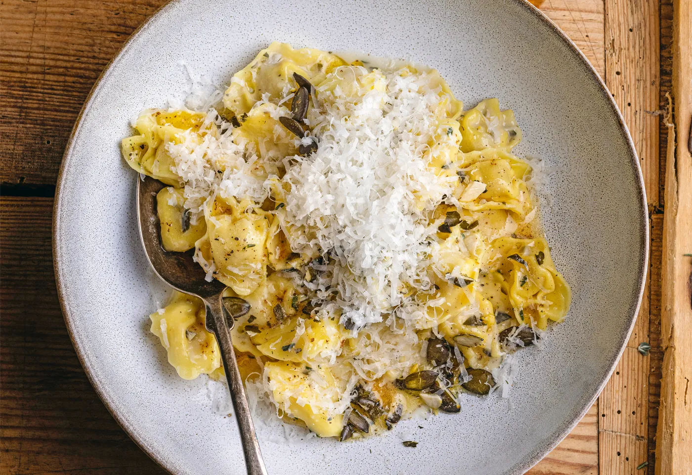 Tortellini in Nussbutter mit gerösteten Kürbiskernen & Hartkäse