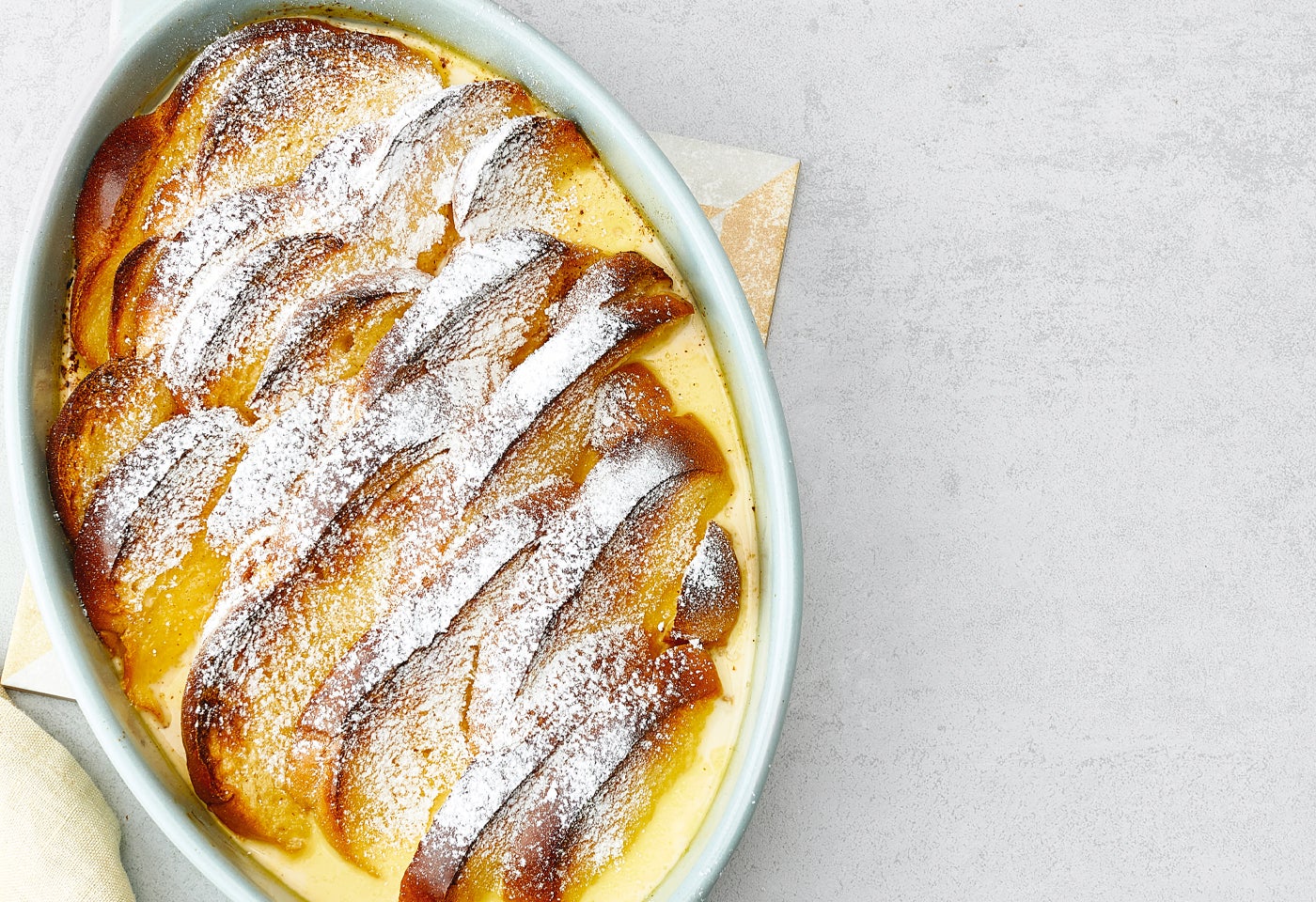 100 ml Kondensmilch und 100 ml Schlagobers verrühren und über den heißen Auflauf gießen. 10 Minuten rasten lassen, bis der Striezel die Flüssigkeit aufgesogen hat. Mit Staubzucker bestreuen und servieren.