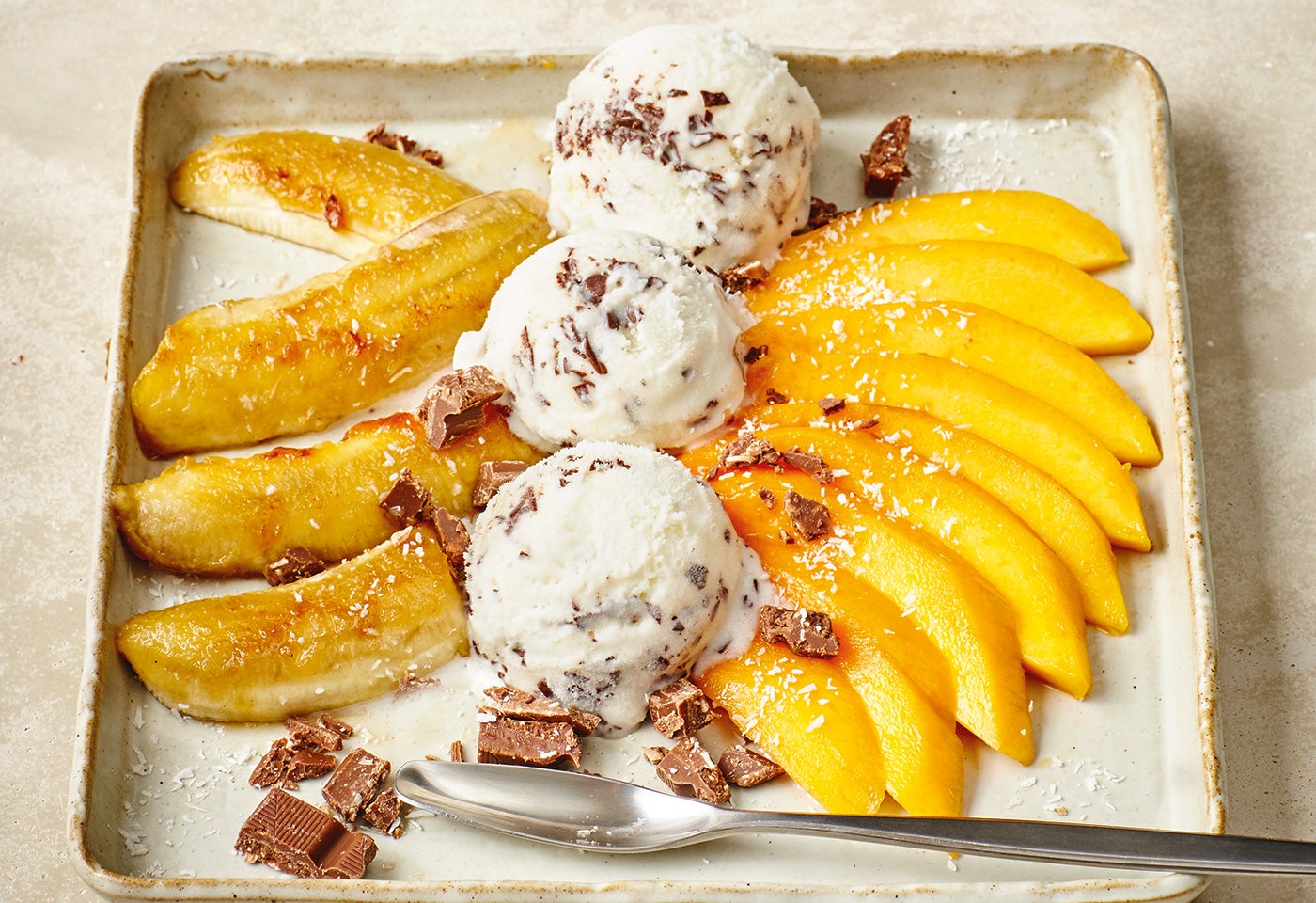 Tropischer Eisteller mit Mango, Banane und Kokosschokolade