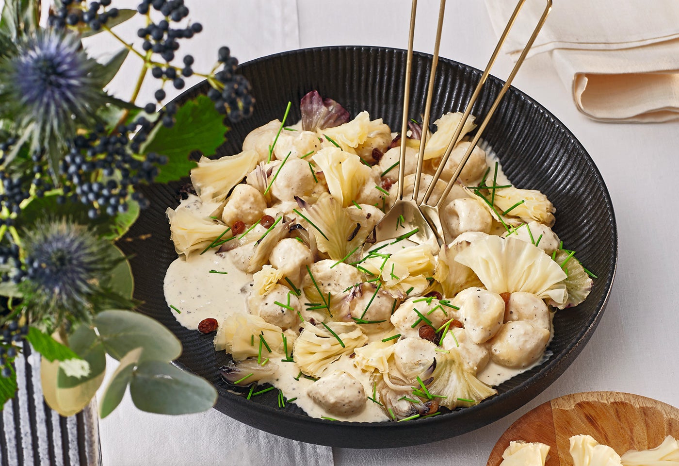 Radicchio, Rosinen, Käse und Gnocchi samt Sauce anrichten. Mit Schnittlauch bestreuen und servieren.