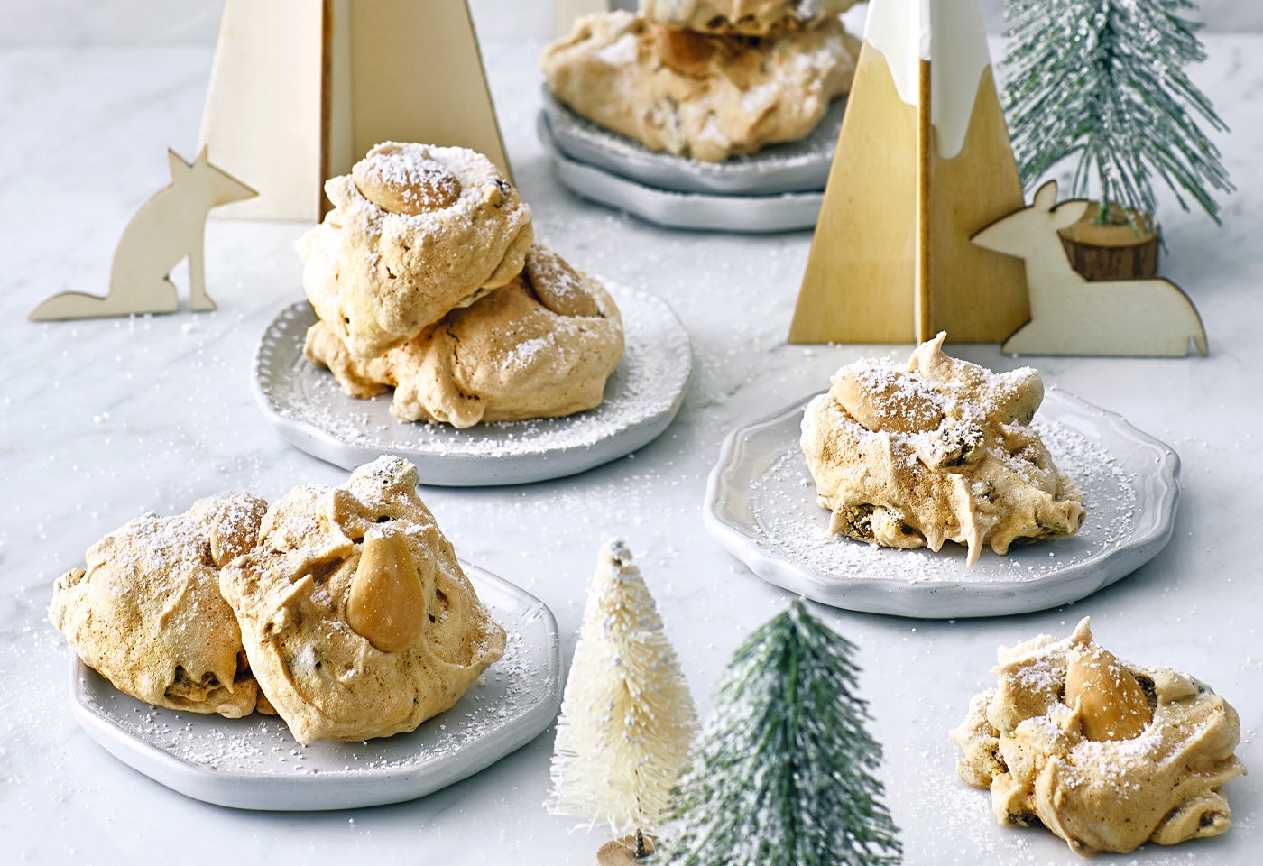 - accessibility.recipes.cookingstepBackrohr auf 140 °C (Ober-/Unterhitze, 120 °C Umluft) vorheizen. Eiklar, Salz und 1 TL Feinkristallzucker in einer fettfreien Rührschüssel mit den Quirlen des Handmixers ca. 3 Minuten steif schlagen. Nacheinander esslöffelweise restlichen Feinkristallzucker dazugeben und jeweils 10 Sekunden schlagen, bis der Zucker verbraucht und ein fester Schaum entstanden ist. Stärke dazugeben und kurz unterschlagen. Eingeweichte Früchte und Mandeln hinzufügen und zügig mit einem Teigspatel unter den Eischnee heben.