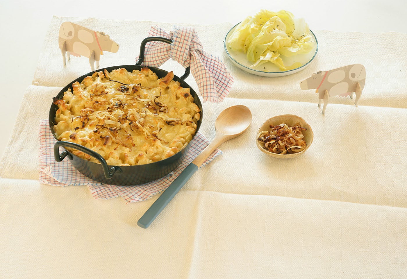 Fülle ein Drittel der Spätzle in die Auflaufform, verteile den Speck und ein Drittel des Käses darüber. Gib ein weiteres Drittel der Spätzle, die Hälfte der Zwiebel und ein weiteres Drittel des Käses darüber. Nun gibst du den Rest der Spätzle darauf, pfefferst und streust den restlichen Käse darüber. Überbacke die Spätzle im vorgeheizten Backrohr, bis der Käse goldbruan ist. Das dauert etwa 15 Minuten. Streue dann die restlichen Zwiebeln darüber.