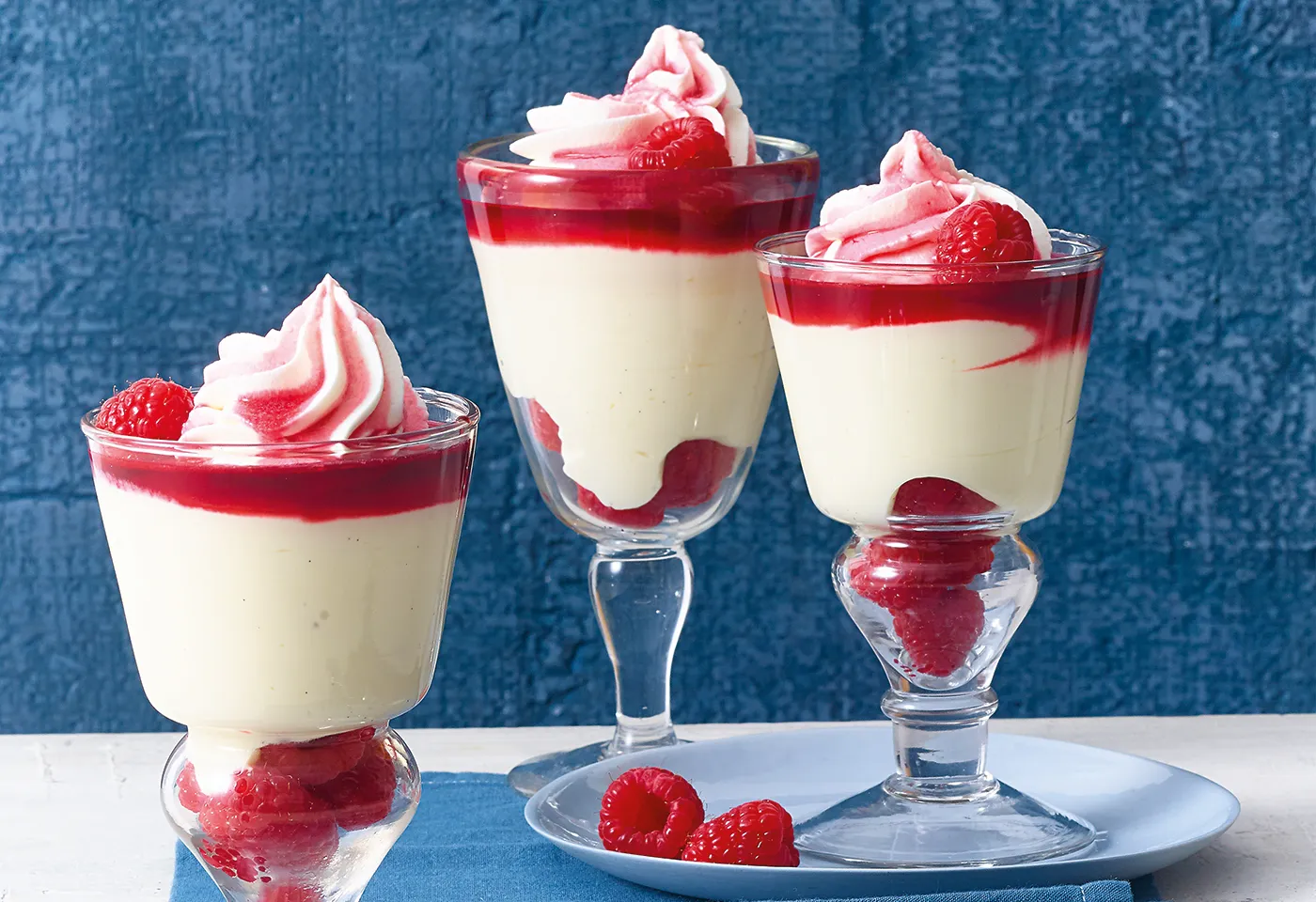 - accessibility.recipes.cookingstepTopfen glatt rühren und unter den Pudding rühren. Obers steif schlagen und die Hälfte davon unter den Pudding heben. Die Hälfte der frischen Himbeeren auf 4 Gläser (à 350 ml) verteilen. Den Pudding in einen Spritzbeutel ohne Tülle füllen und in die Gläser spritzen. Restliches Obers in einen Spritzbeutel mit Sterntülle füllen und jeweils einen Gupf auf die Puddinge spritzen. Mit den restlichen frischen Himbeeren garnieren. Bis zum Servieren kalt stellen.