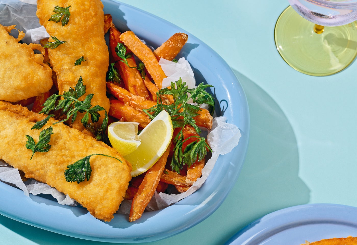 Vish ’n’ Sweet Potato Chips mit Remoulade