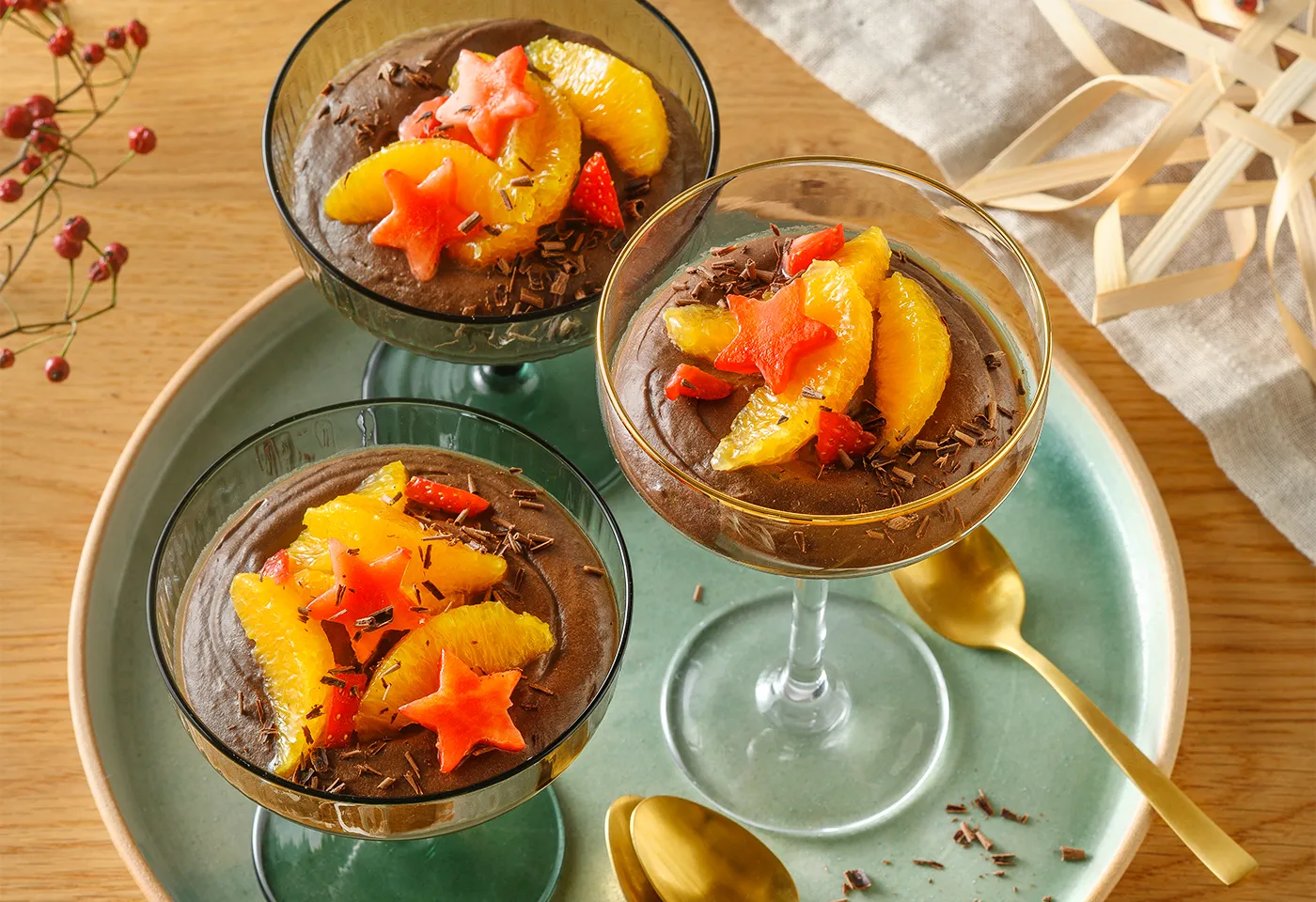 Weihnachtliches Avocado-Schokomousse mit Orangen und Erdbeeren