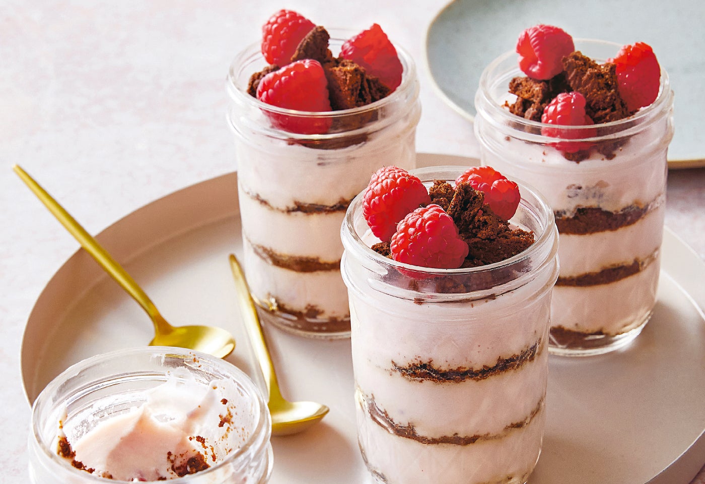 Vor dem Servieren mit zerbröselten Schokoladenkeksen und frischen Himbeeren garnieren. Die Desserts können bis zu 3 Tage im Voraus zubereitet und in den Gläsern im Kühlschrank aufbewahrt werden. Am besten direkt aus dem Kühlschrank servieren.