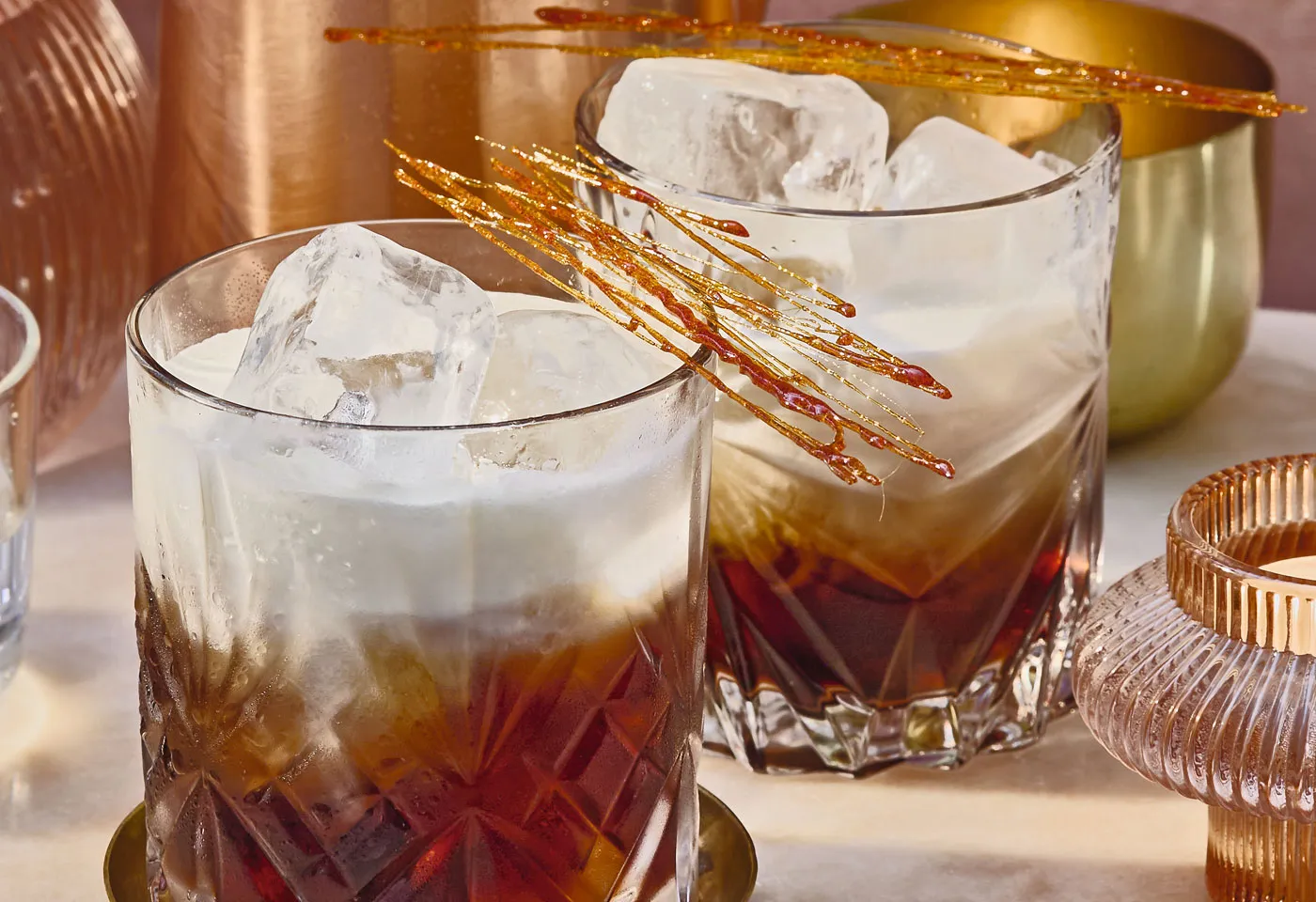 Obers nur kurz dickflüssig aufschlagen und vorsichtig über den Drink fließen lassen, sodass zwei Schichten entstehen. Die Karamellgitter auflegen und sofort servieren.