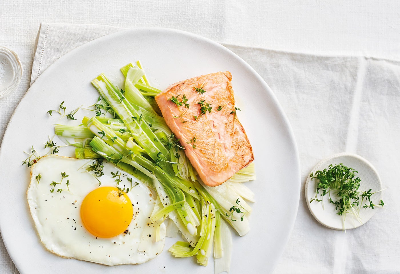 Lauchgemüse, Lachs und Spiegeleier anrichten, mit Kresse bestreuen und servieren.