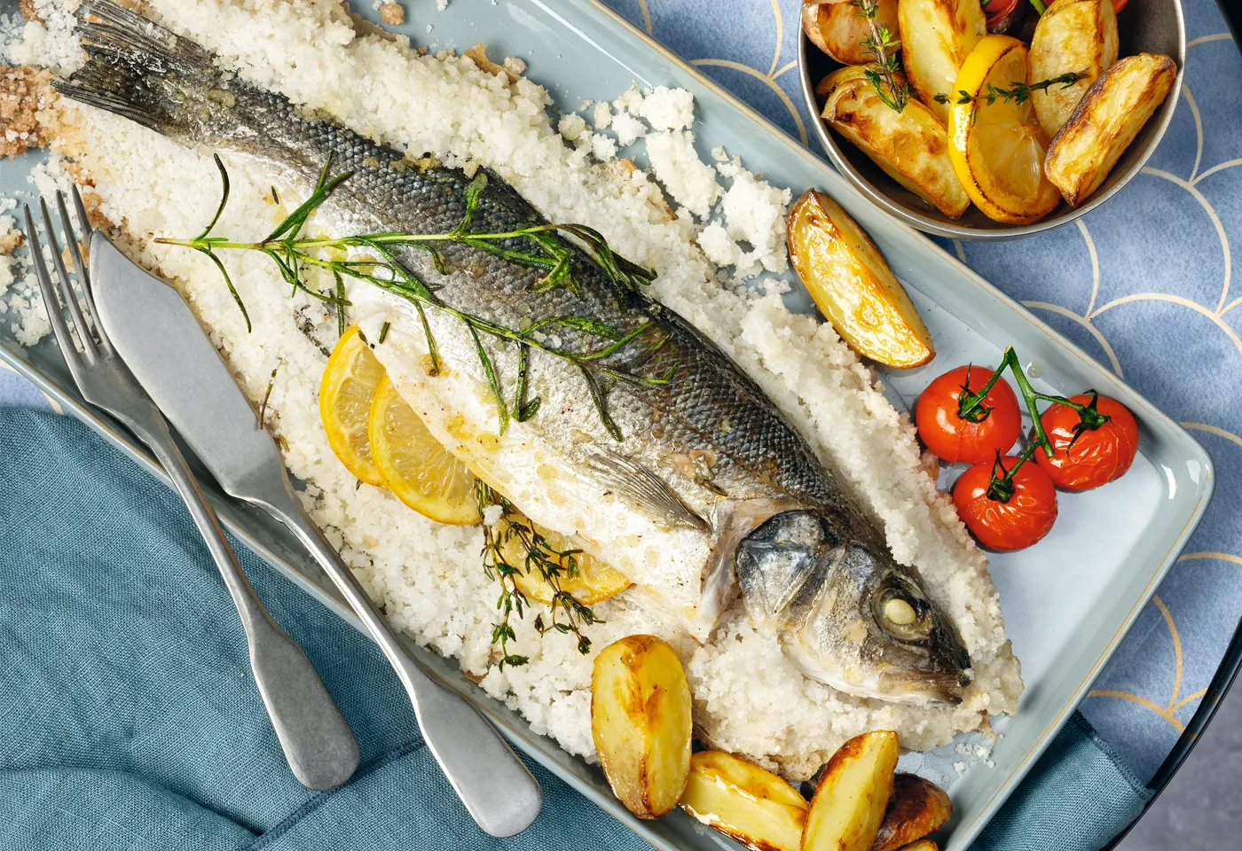 Wolfsbarsch in Kräuter-Salzkruste mit Ofentomaten und Ofenerdäpfeln