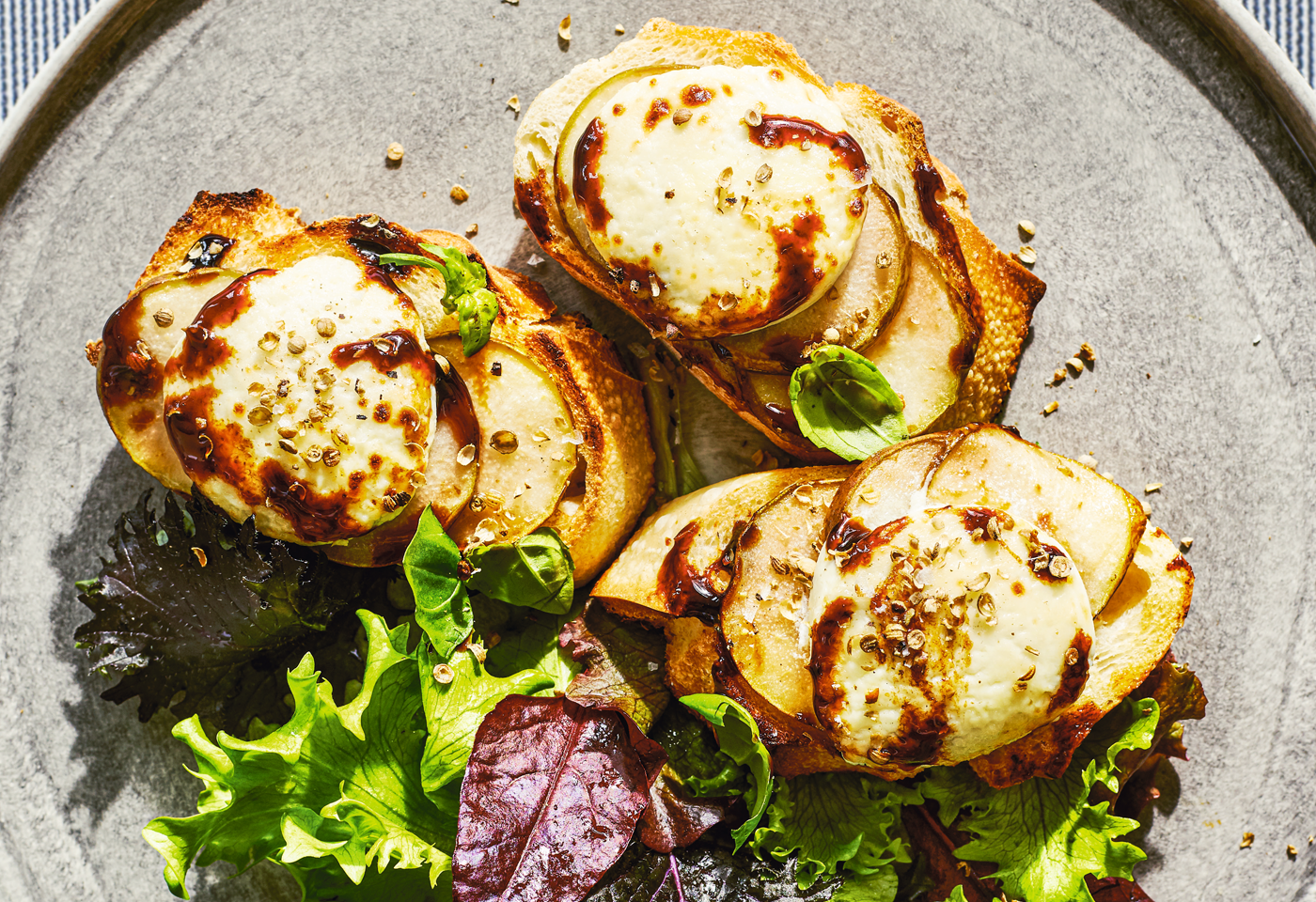 Jede geröstete Baguettescheibe mit Birne und Käse belegen. Alles mit Balsamico- Creme beträufeln, dann grillen, bis der Käse zu schmelzen beginnt und dunkel wird. Mit Basilikum und Koriandersamen bestreut servieren.