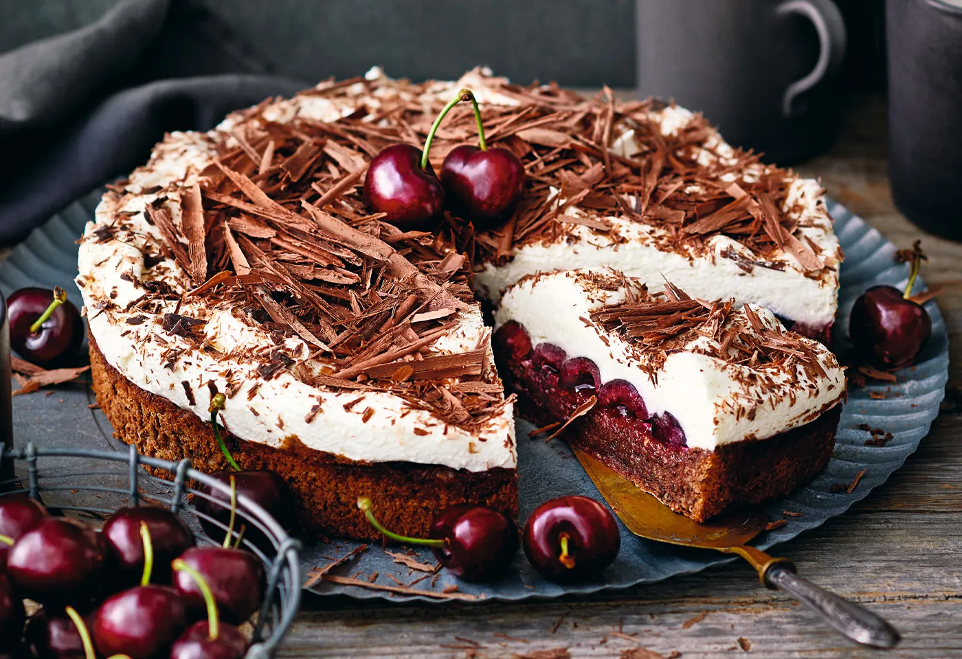 - accessibility.recipes.cookingstepKuchen aus der Form lösen, wenden und das Backpapier abziehen. Erneut wenden (sodass die Oberseite nun wieder nach oben zeigt) und auf einen Servierteller legen. Kirschlikör auf den Kuchen träufeln. Marmelade glatt rühren und daraufstreichen. Halbierte Kirschen mit der Schnittfläche nach unten auf die Marmelade legen.