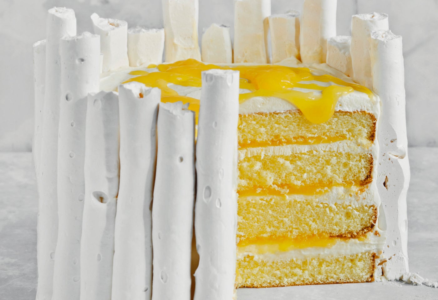 Baiser in unterschiedlich lange Stücke (aber mindestens so hoch wie der Kuchen) brechen. Die Stangen aufrecht an den Rand der Torte drücken. Torte mit dem restlichen Lemon Curd beträufeln.