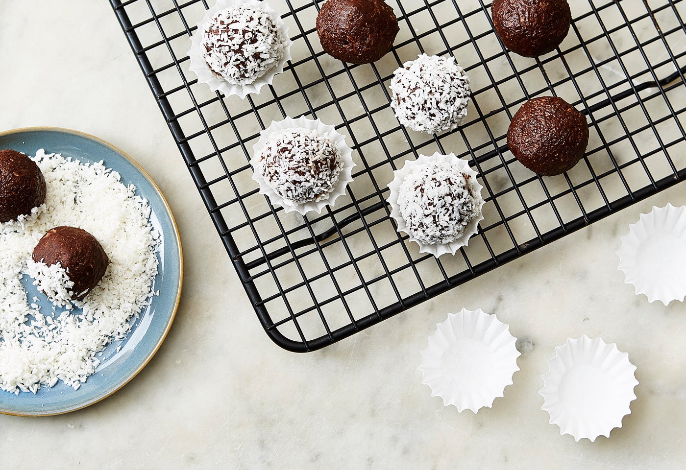 Jeweils ein teelöffelgroßes Stück Schokoladenmasse mit leicht befeuchteten Händen zu Kugeln formen und anschließend in Kokosette wälzen. In Papierförmchen setzen. Kühl aufbewahren.