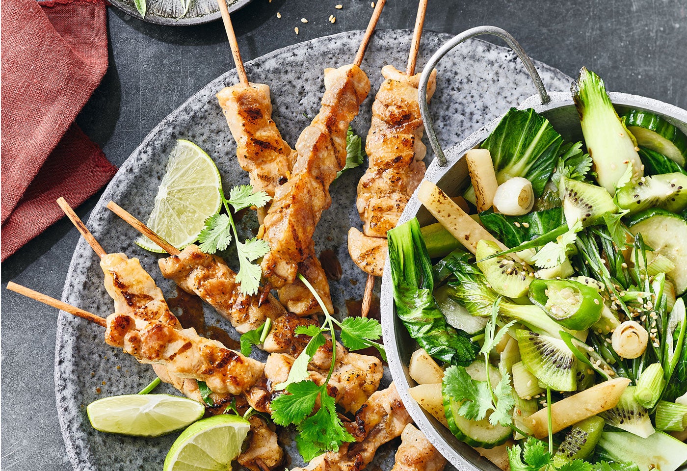 Grill-Teriyakispiesse mit grünem Gemüse-Kiwi-Salat und Knoblauchbrot