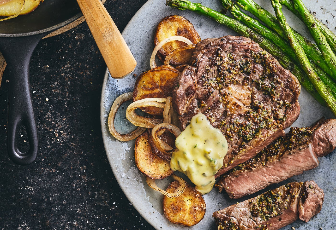 Kräuter-Rib-Eye-Steak mit gegrilltem Spargel und Braterdäpfeln