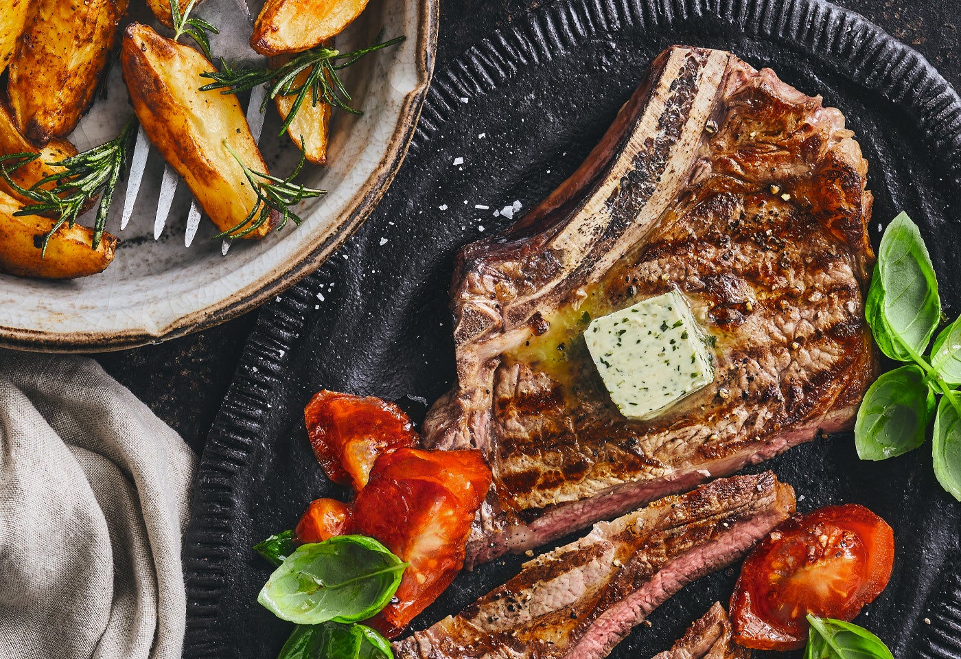 Rib-Steak mit Kräuterbutter und gegrillten Tomaten