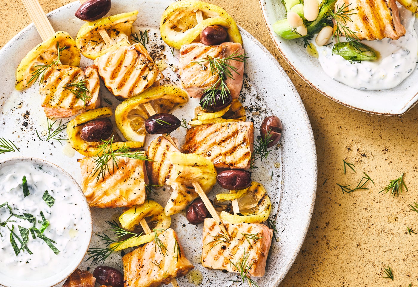 Lachs-Zitronen-Spieße mit Bohnen-Gurken-Salat