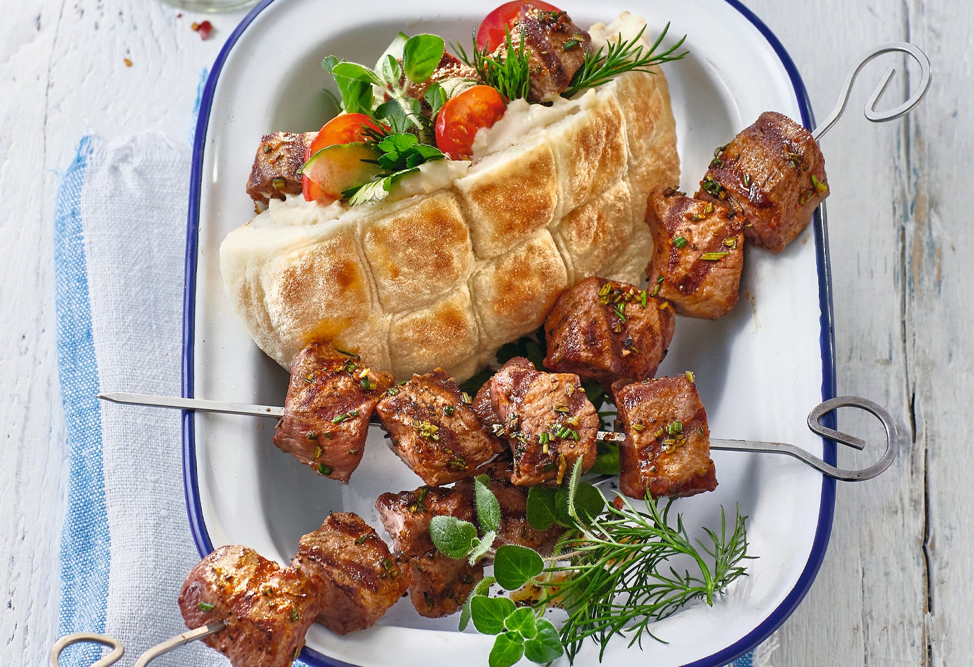 Steak-Gemüse-Spieße mit Braterdäpfeln und Blauschimmelkäse-Dip