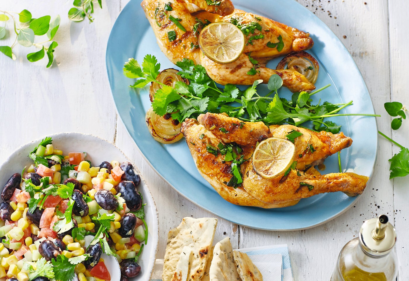 Limetten-BBQ-Gockel mit Mais-Bohnen-Salat und Petersilien-Fladenbrot