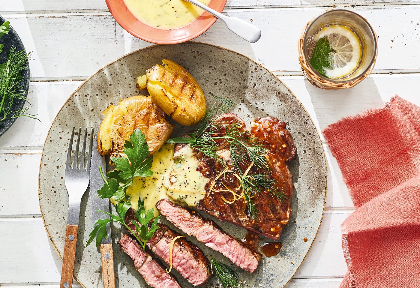 Gegrilltes Rib Eye Steak mit cremigem Grillmais und Quetscherdäpfeln