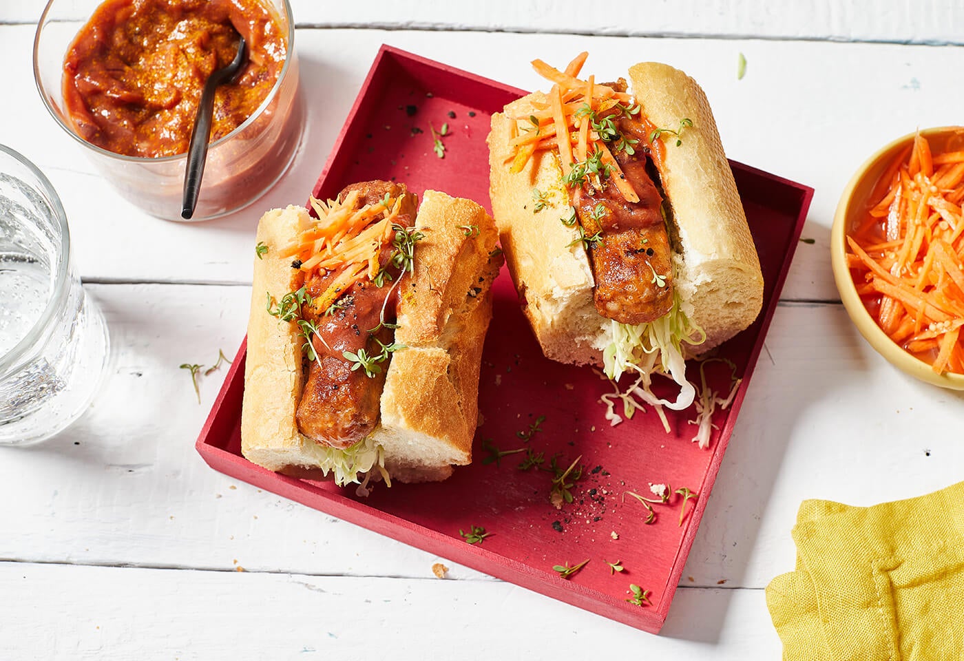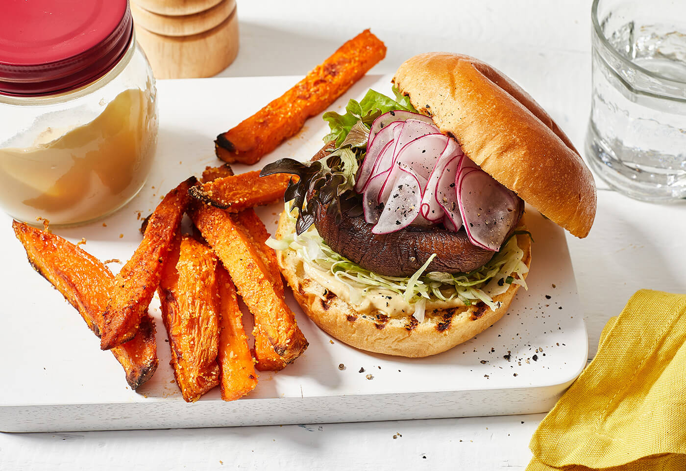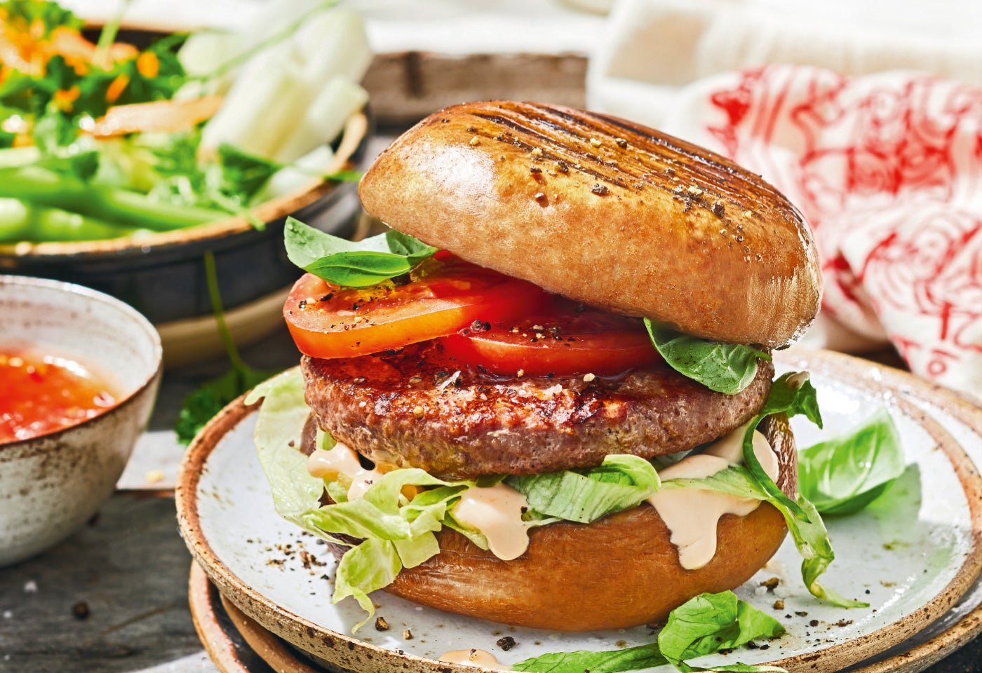Beyond Meat Burger mit Hummus und sauren Zwiebeln