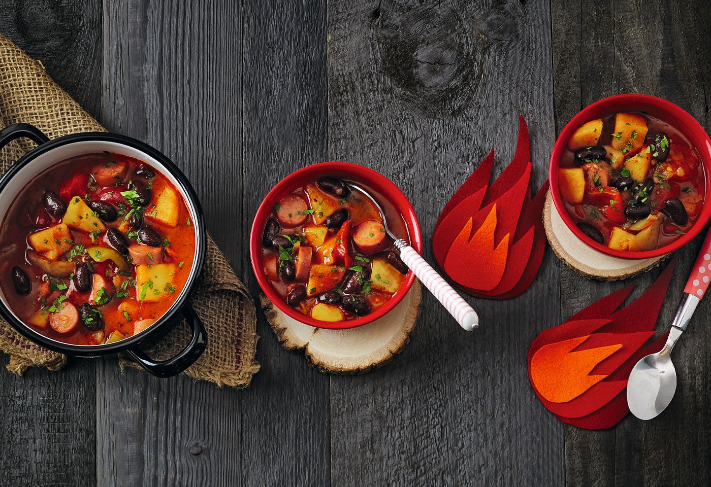 Lagerfeuereintopf mit Würsteln, Bohnen und Paprika