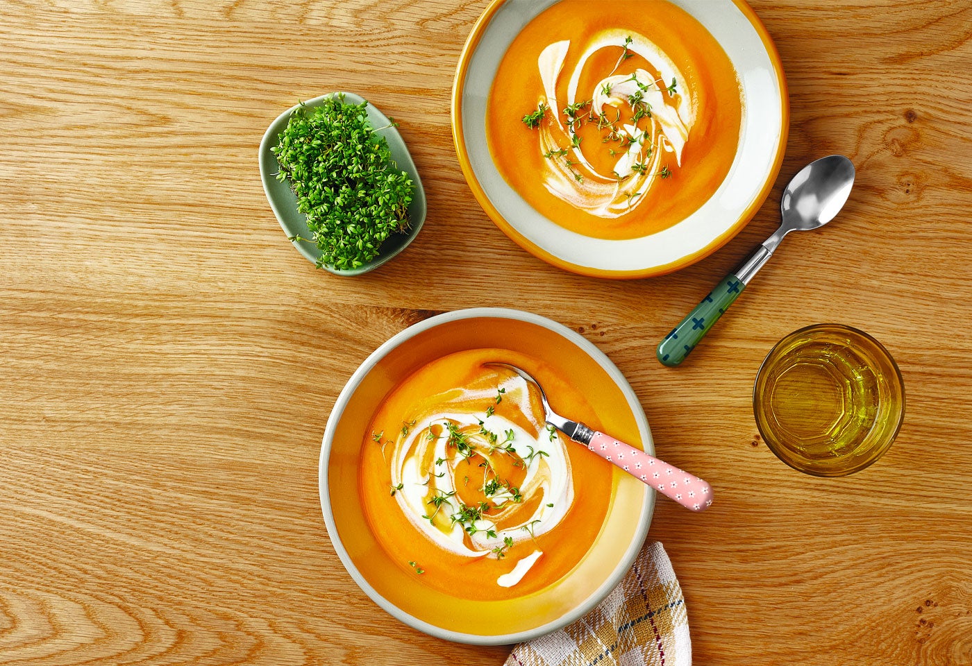 Bio-Süßkartoffel-Orangen-Suppe mit Joghurt und Kresse