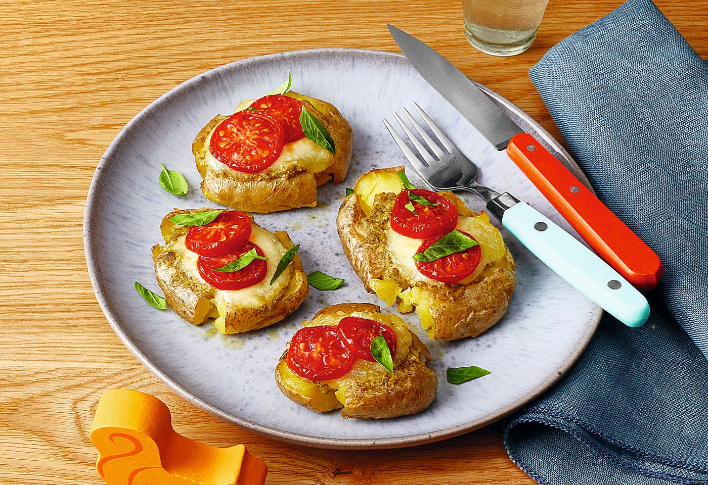 Überbackene Bio-Quetsch-Erdäpfel mit Mozzarella und Tomaten