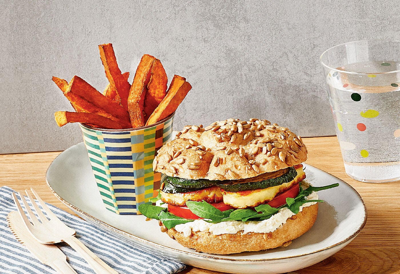 Halloumi-Burger mit Süßkartoffel-Pommes