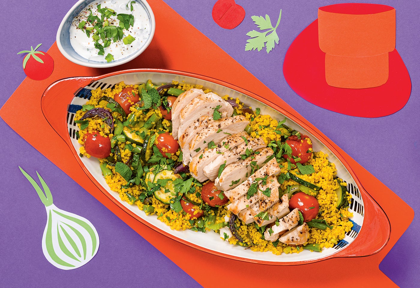 Gemüse-Couscous mit Hendlfilet und Kräuter-Joghurt