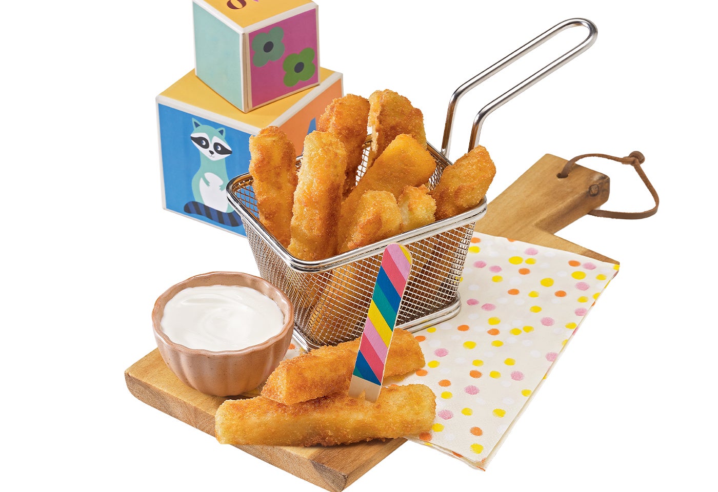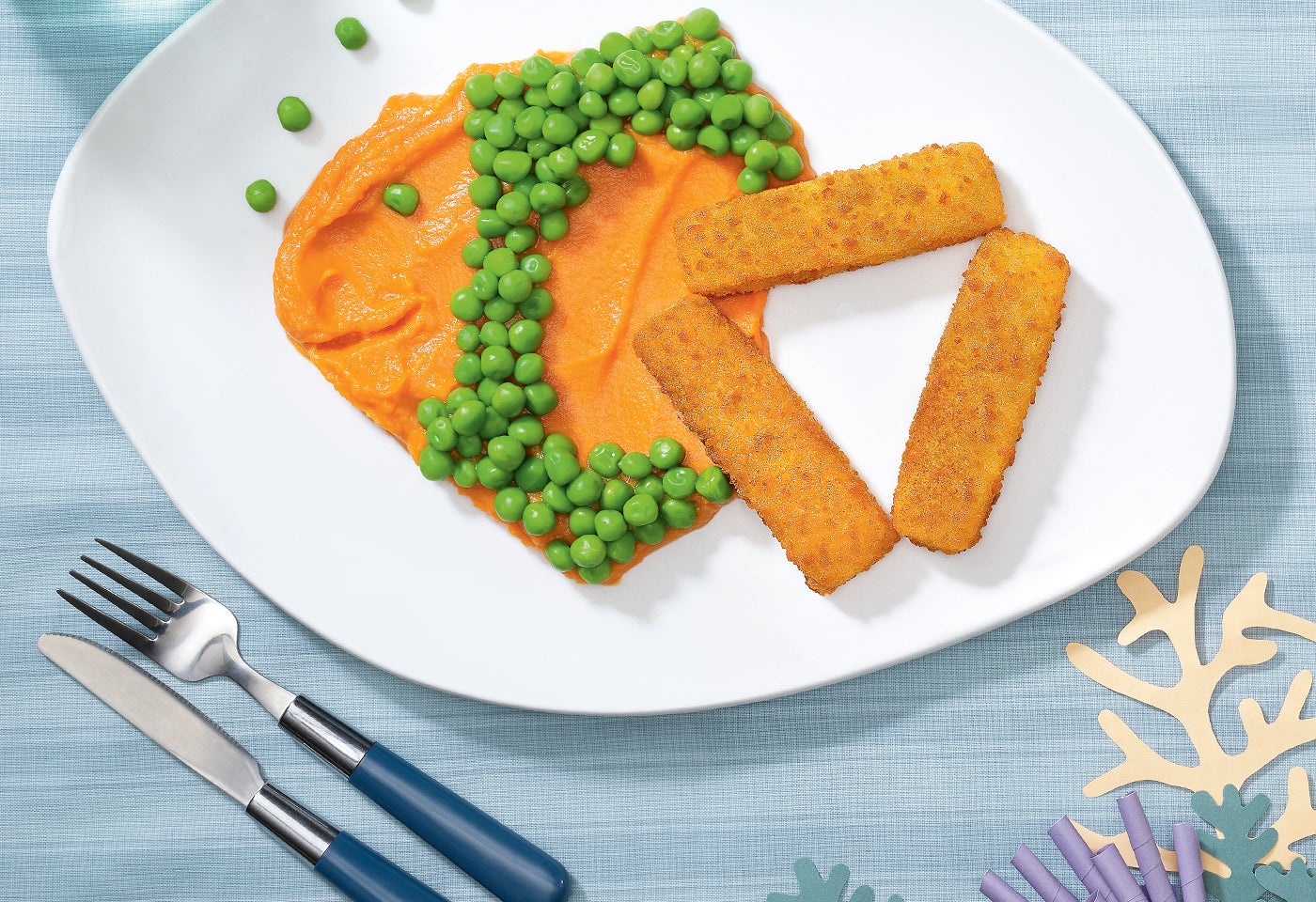 Fischstäbchen mit Erbsen und Süßkartoffelpüree