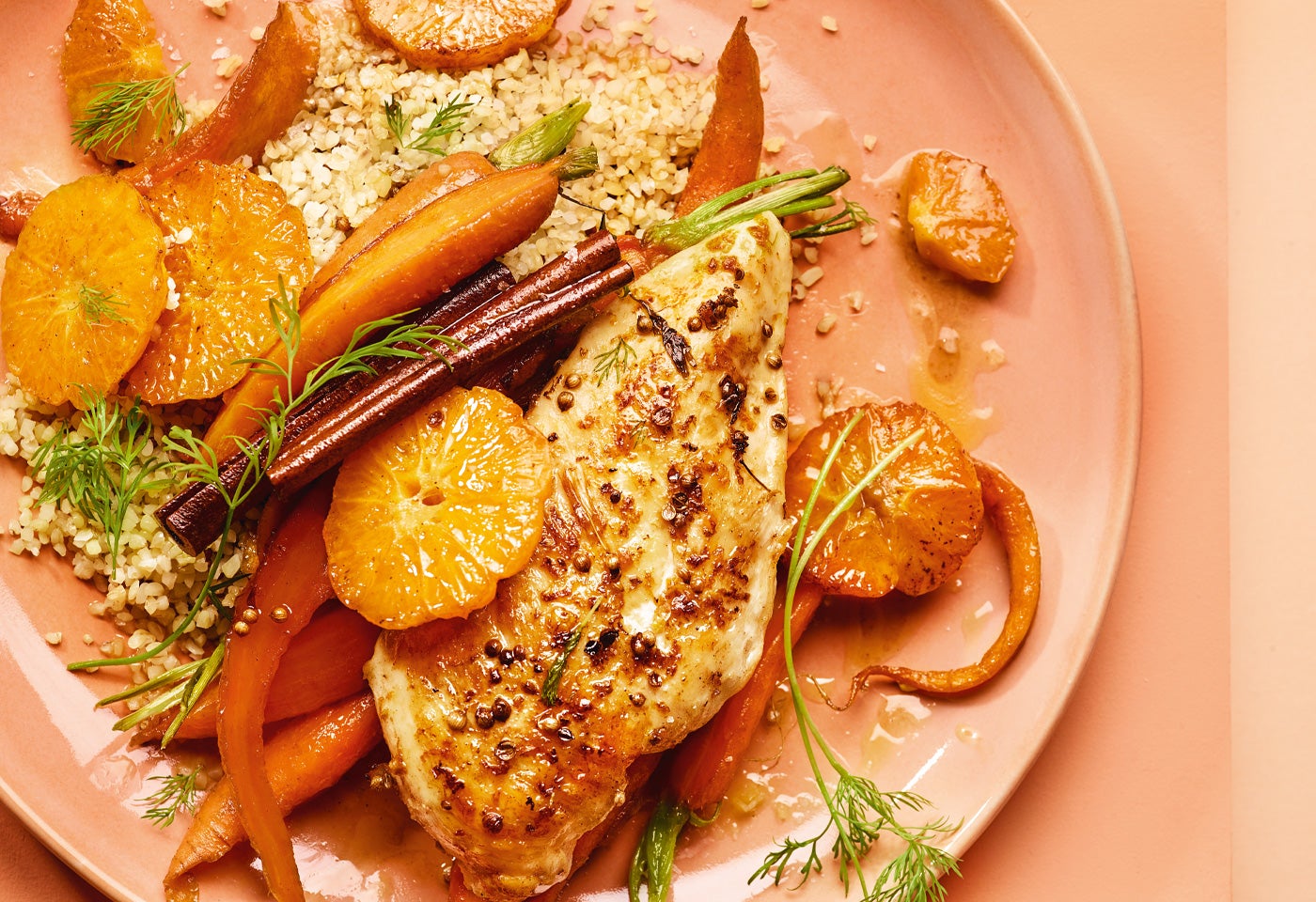 Koriander-Hendlbrust mit warmen Clementinen und karamellisierten Karotten
