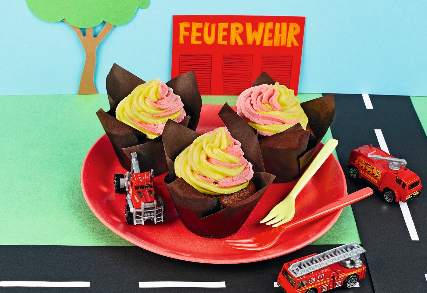 Feuer-Cupcakes mit Mango-Himbeer-Creme