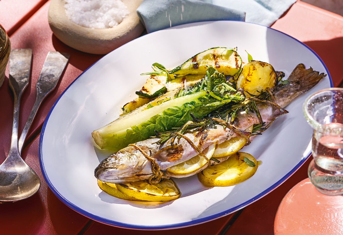 Kräutersaibling vom Grill mit Zucchini und Salatherzen