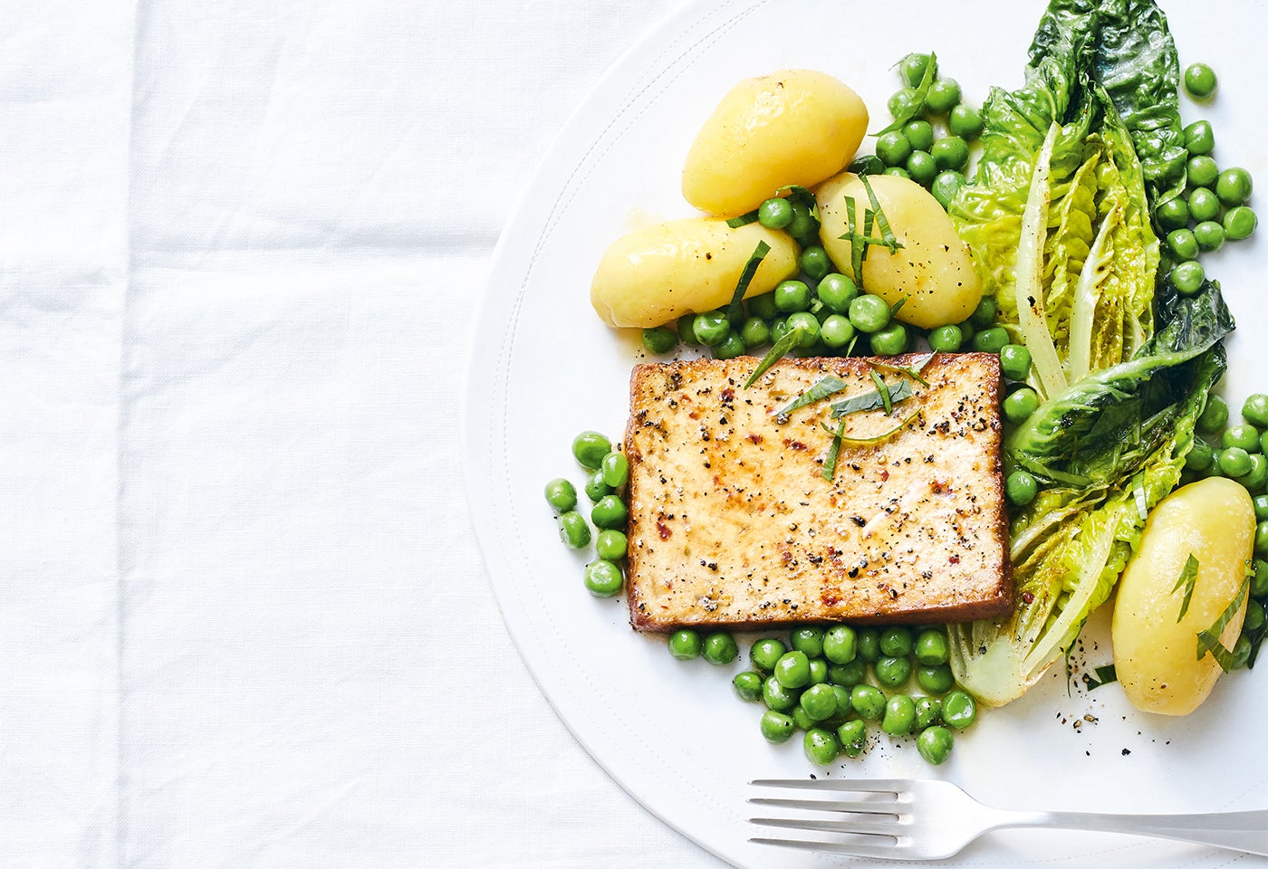 Fleischloser Leberkäse mit Salatherzen, Erdäpfeln und Erbsen