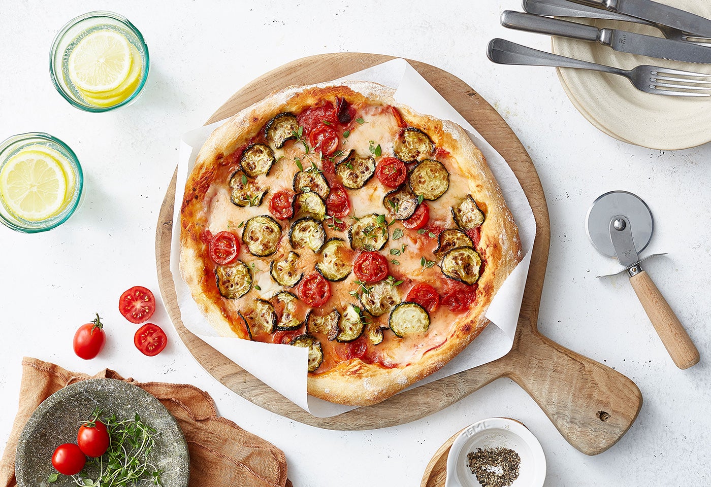 Vegane Pizza mit gebratenen Zucchini und Tomaten